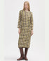 Long dress with Square Leaves print. Round neck and pockets in side seams. Back with darts, seam and concealed zip. Back vent.