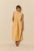 Fitted shoulders and half-placket buttoned closure. Gathered midi skirt with hidden pockets on side seams. Organic cotton poplin fabric.