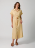 Midi length button front shirt dress with collar. Cuffed sleeves, raffia d-ring buckle and self fabric belt. Perfect for summer or spring!